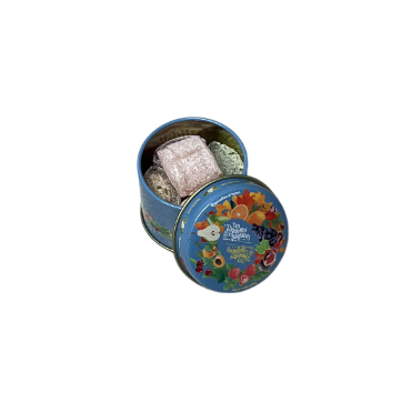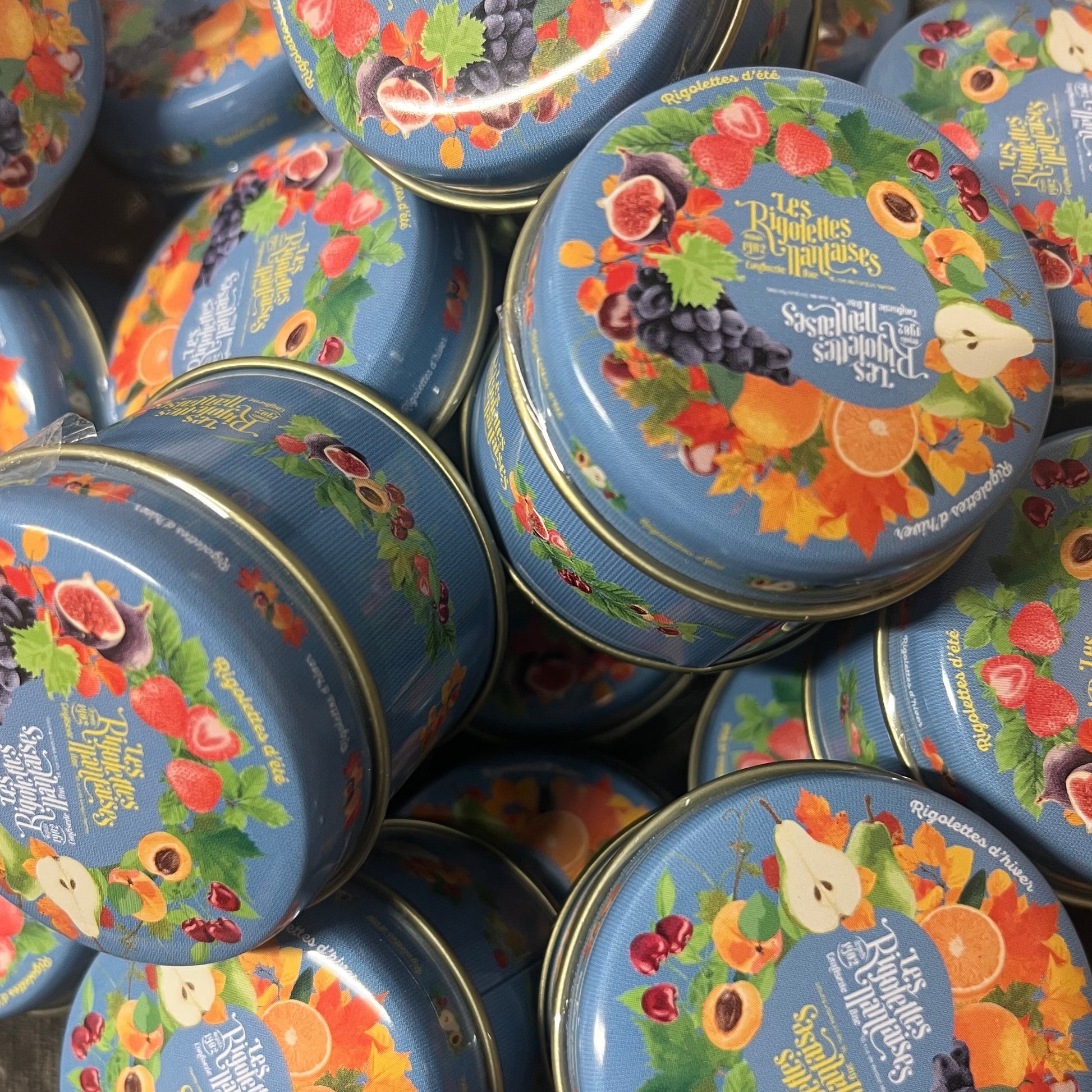 Boites rondes métalliques de rigolettes aux parfums de saison Automne Hiver ( chataigne, poire, myrtille, passion, pomme verte )