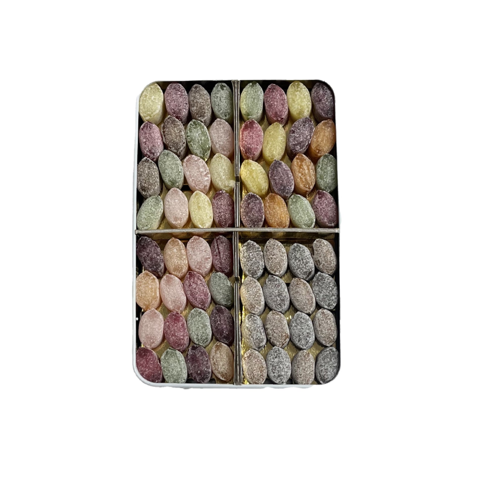 Parfum fleurs: Sucre, sirop de glucose-fructose, blé sirop glucose de blé (sulfites) pulpe de Pomme, sorbitol et arômes (coquelicot fleur d’oranger hibiscus violette rose), acide citrique, denrées alimentaires colorantes : carotte, cassis, hibiscus, jus de pomme, curcuma, paprika et spiruline. Peut contenir du sulfites, des traces de LAIT et de FRUITS A COQUES.
